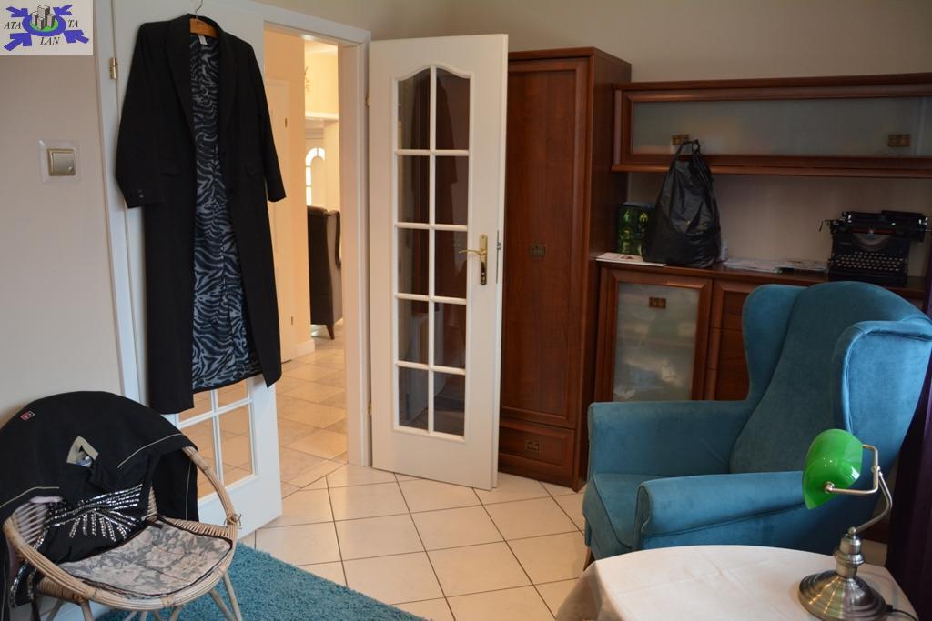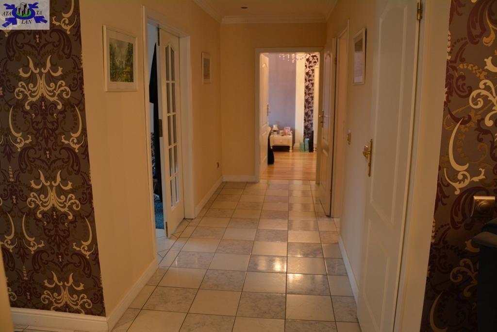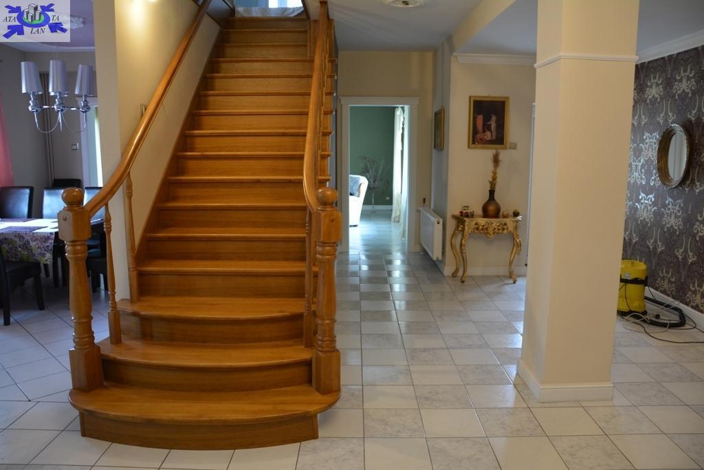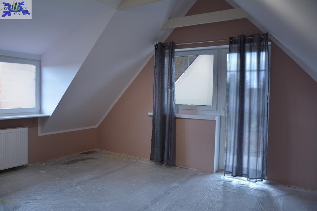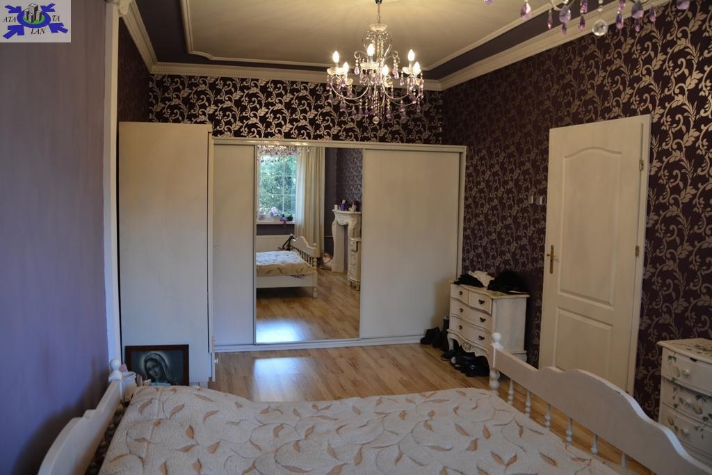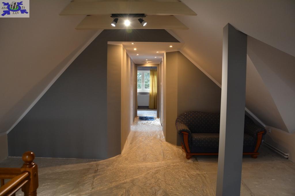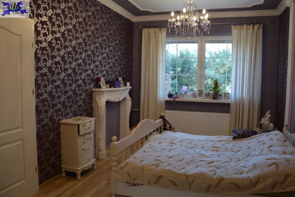 Cały parter wykończono z dbałością o detale. W kuchni, hallu, salonie i na korytarzu na podłodze wysokiej jakości kafle, ściany gładzone i malowane, liczne zdobienia. Duża sypialnia na podłodze panele, ściany gładzone, malowane, również częściowo położono ozdobną tapetę, szafa w zabudowie. Obok mniejszy pokój, pełniący rolę gabinetu. Duży pokój kąpielowy z wanną oraz oddzielna toaleta z umywalką w ładnej, nowoczesnej glazurze i terakocie. Na piętro prowadzą szerokie drewniane dębowe schody. Na piętrze duża przestrzeń typu open space z wyjściem na balkon, trzy pokoje (jeden z wyjściem na osobny balkon), garderoba oraz pokój kąpielowy. Ściany w pomieszczeniach gładzone, malowane. Pokój kąpielowy wykończony ze starannością nowoczesna glazura, terakota, wanna w zabudowie. Z hallu zejście do piwnicy oraz wyjście na duży taras (około 20m2) i ogród.