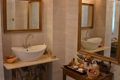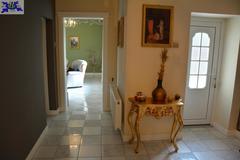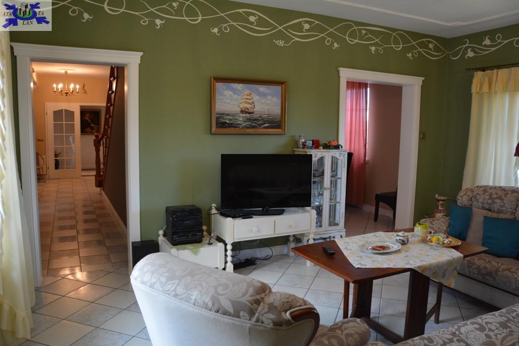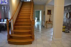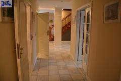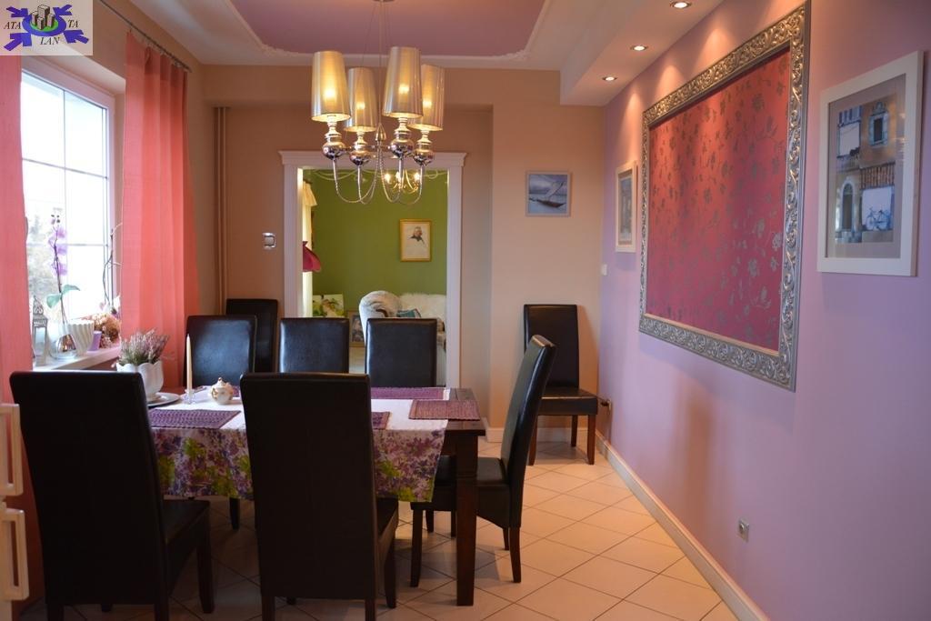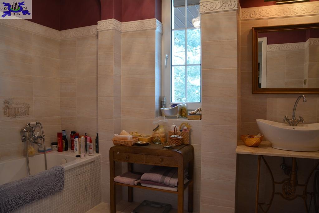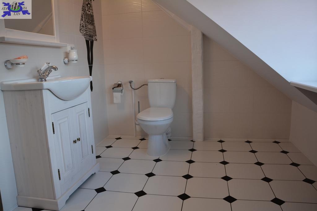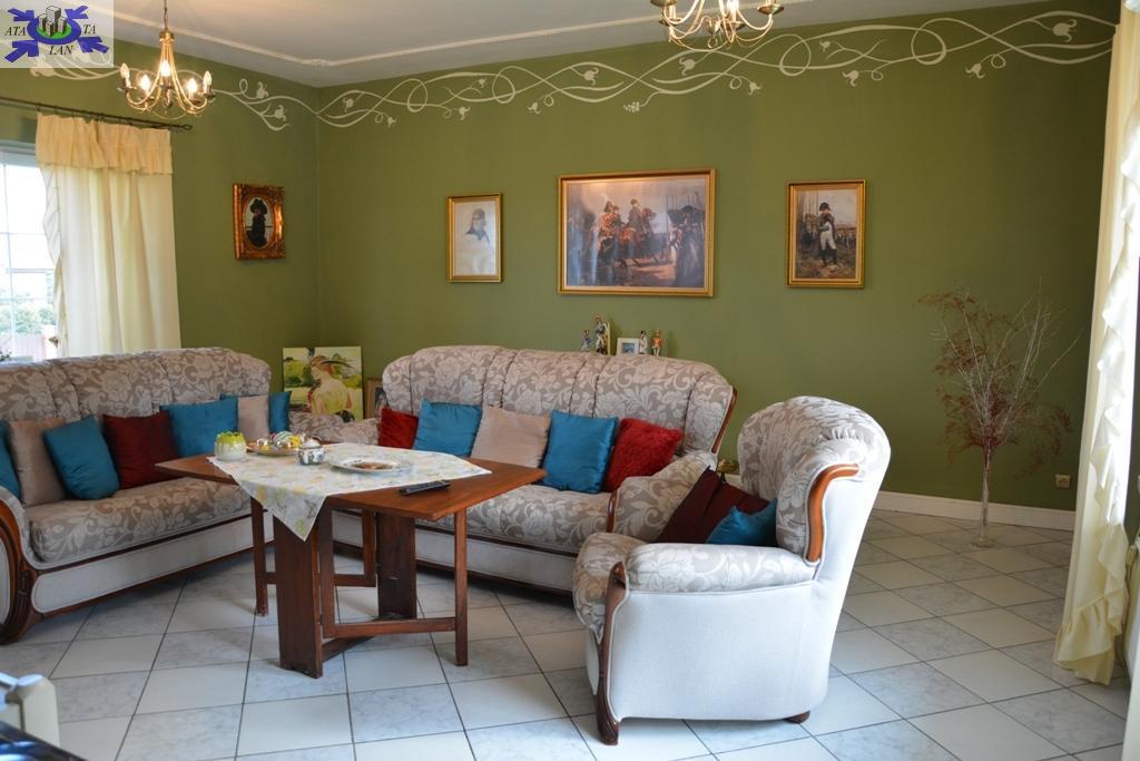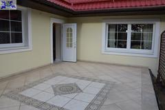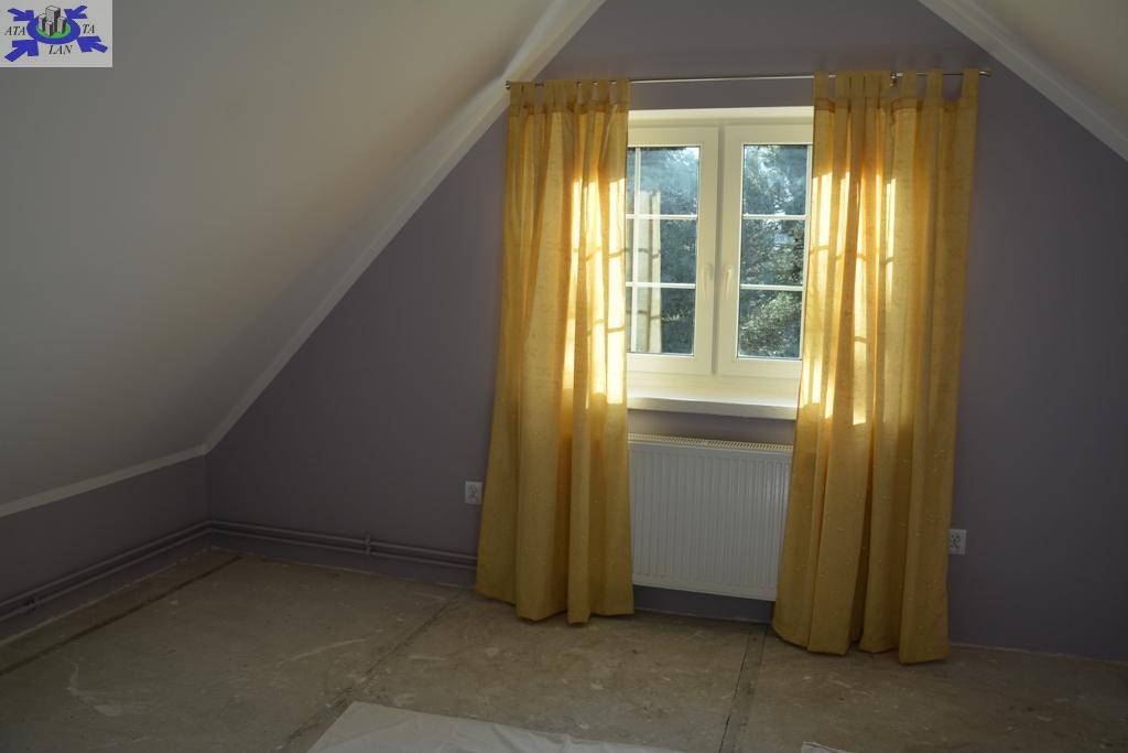 Cały parter wykończono z dbałością o detale. W kuchni, hallu, salonie i na korytarzu na podłodze wysokiej jakości kafle, ściany gładzone i malowane, liczne zdobienia. Duża sypialnia na podłodze panele, ściany gładzone, malowane, również częściowo położono ozdobną tapetę, szafa w zabudowie. Obok mniejszy pokój, pełniący rolę gabinetu. Duży pokój kąpielowy z wanną oraz oddzielna toaleta z umywalką w ładnej, nowoczesnej glazurze i terakocie. Na piętro prowadzą szerokie drewniane dębowe schody. Na piętrze duża przestrzeń typu open space z wyjściem na balkon, trzy pokoje (jeden z wyjściem na osobny balkon), garderoba oraz pokój kąpielowy. Ściany w pomieszczeniach gładzone, malowane. Pokój kąpielowy wykończony ze starannością nowoczesna glazura, terakota, wanna w zabudowie. Z hallu zejście do piwnicy oraz wyjście na duży taras (około 20m2) i ogród.