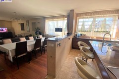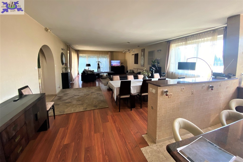 Przestronny salon z bezpośrednim wyjściem na taras i ogród połączony z otwartą, jasną, w pełni umeblowana kuchnią z wyspą kuchenną. Wielkoformatowe okna tarasowe. TARAS zadaszony z wymurowanym kominkiem.