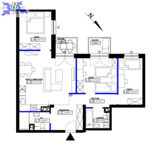* pokój z aneksem kuchennym o pow. 38,88 m2