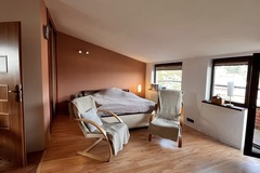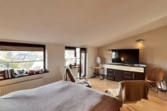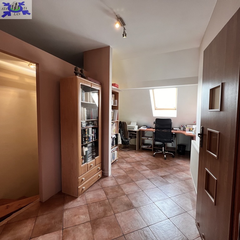 Poddasze użytkowe stanowi otwarta przestrzeń zaaranżowana na sypialnię, małe biuro oraz łazienkę z oknem.