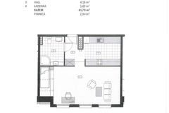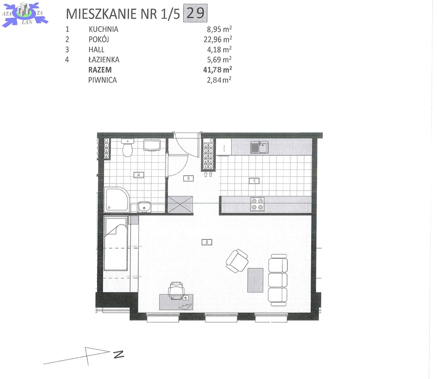 Przedmiotowe mieszkanie znajduje się na czwartym piętrze. Składa się pokoju dziennego o powierzchni 22,96mkw, kuchni otwartej na przedpokój 8,95mkw, łazienki 5,69mkw, hallu 4,18mkw. Piwnica 3,20mkw. Układ okien w pokoju umożliwia wydzielenie drugiego pokoju(sypialenki) poprzez postawienie ścianki działowej.