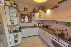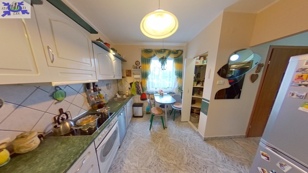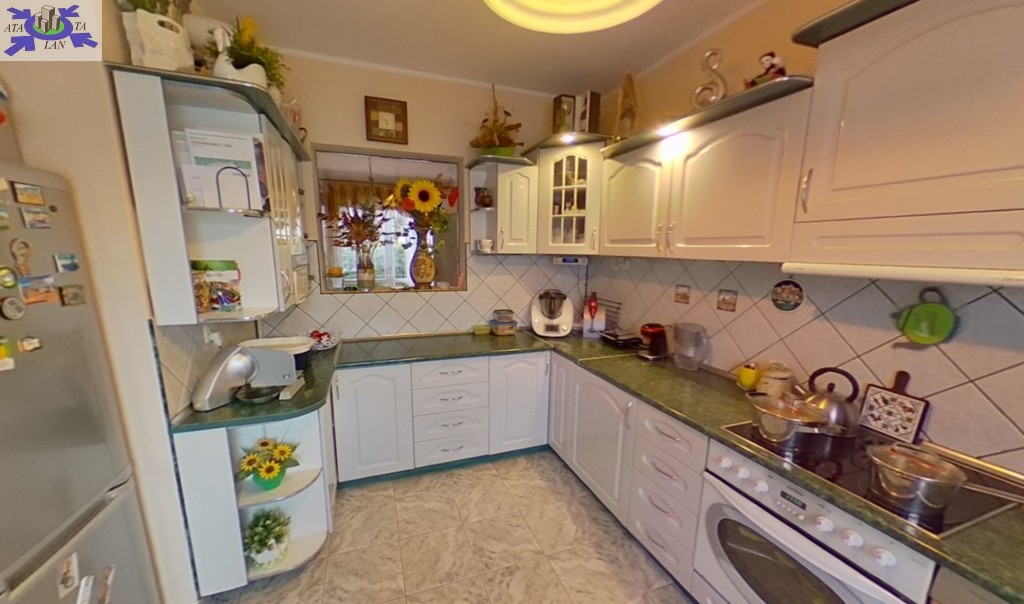 Kuchnia wyposażona w płytę elektryczną, zlewozmywak, meble kuchenne w zabudowie, lodówa z zamrażarką. Dodatkowo wydzielona, zamknięta przestrzeń służąca jako spiżarnia.