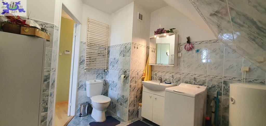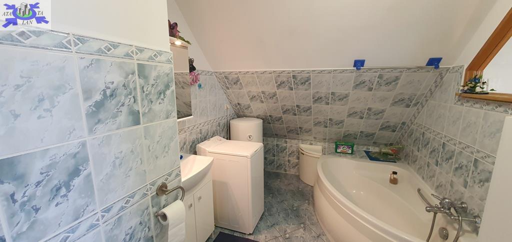 Łazienki w glazurze i terakocie, wyposażone w kabinę prysznicową (na parterze) oraz w wannę (na piętrze). W łazience na piętrze znajduje się pralka.