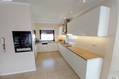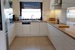 Kuchnia zabudowana na wymiar ładnymi jasnymi meblami, wyposażona w sprzęt AGD w zabudowie.