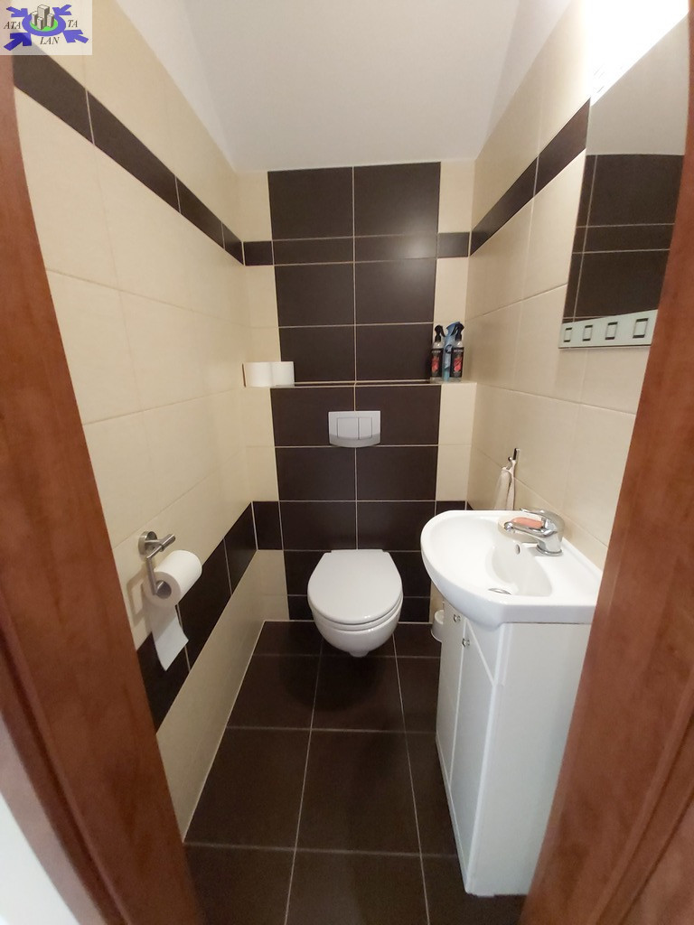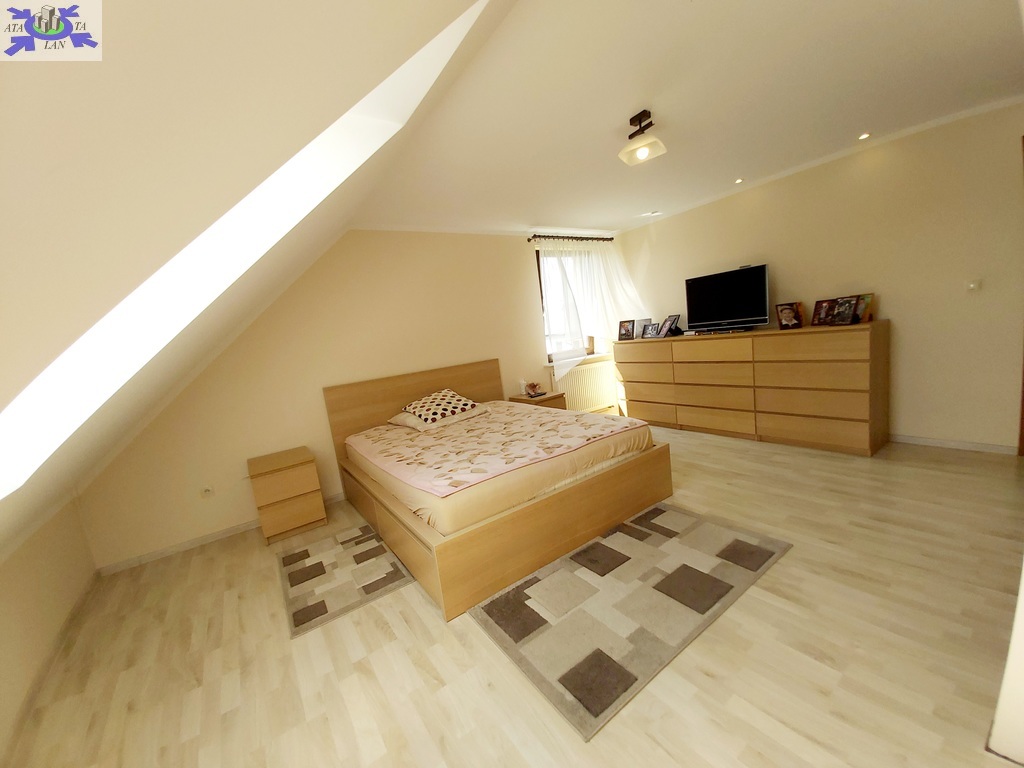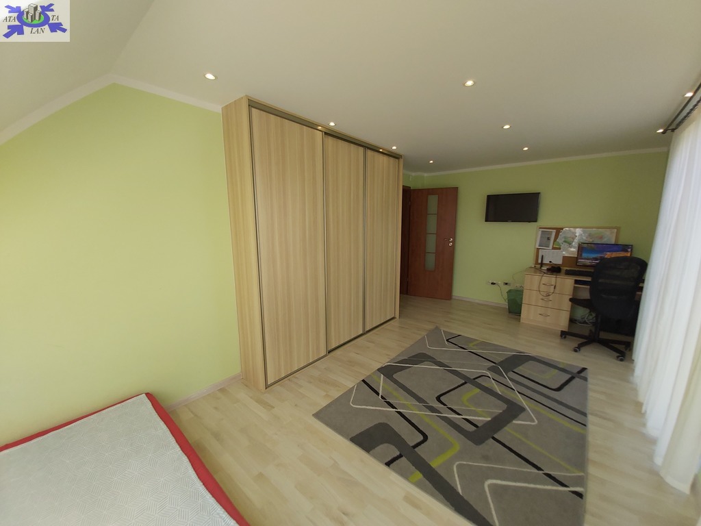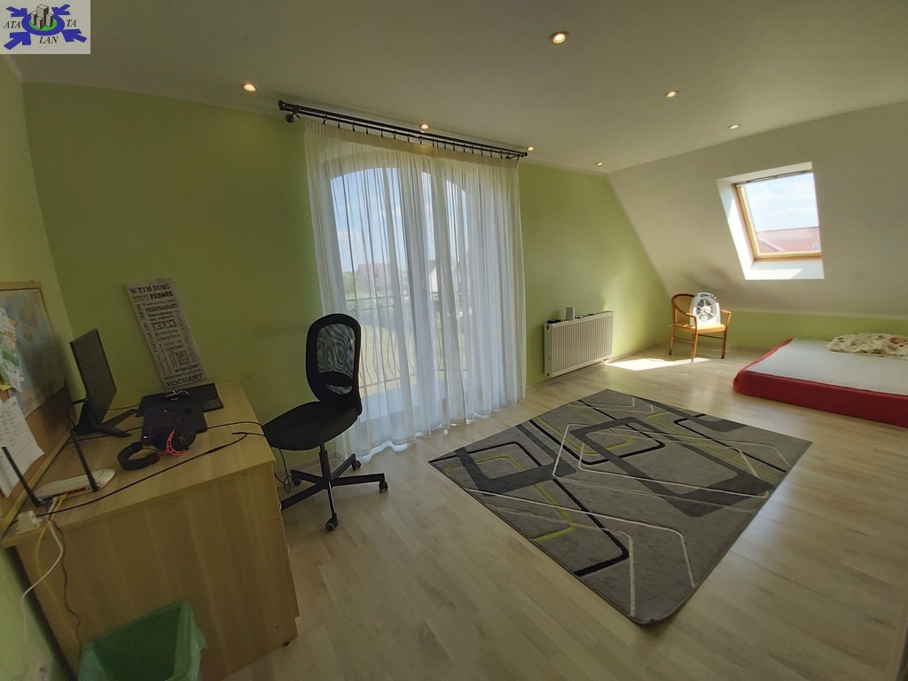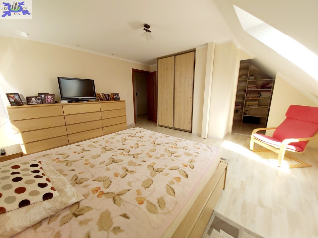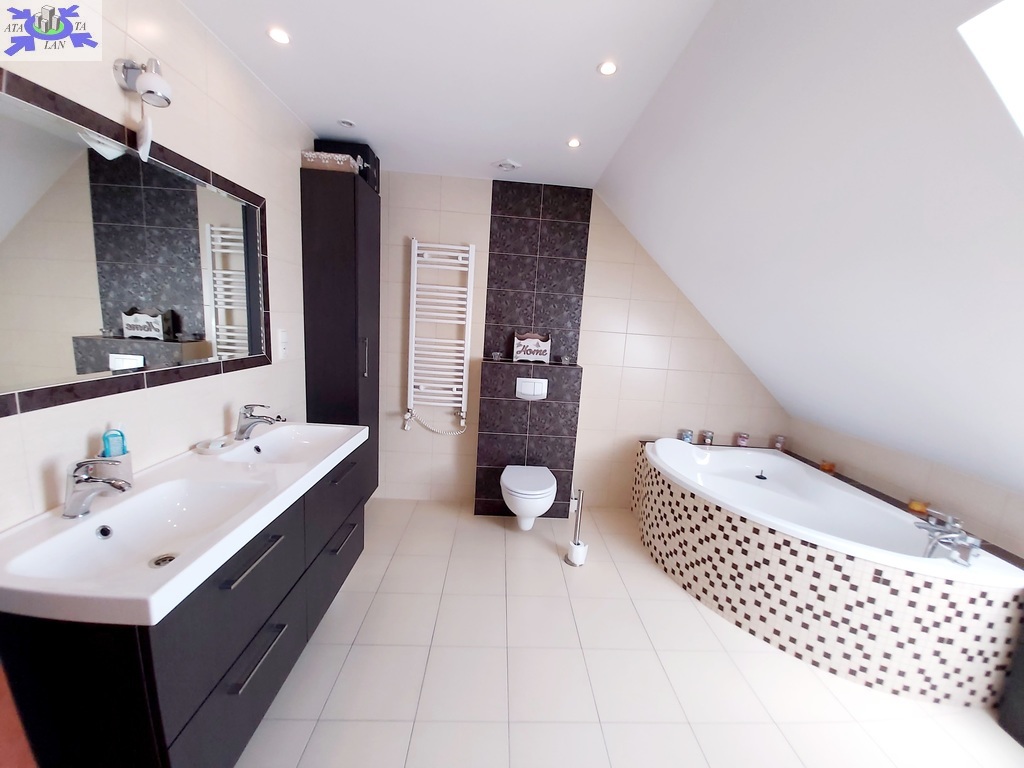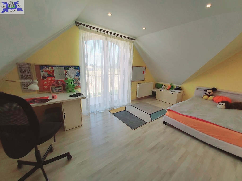 Na piętrze trzy duże ustawne pokoje , w dwóch z nich wyjścia na balkon , trzeci pokój z wejściem do dużej wygodnej garderoby, duża łazienka typu pokój kąpielowy z wanną narożną oraz kabiną prysznicową.