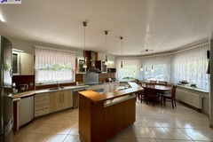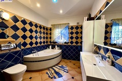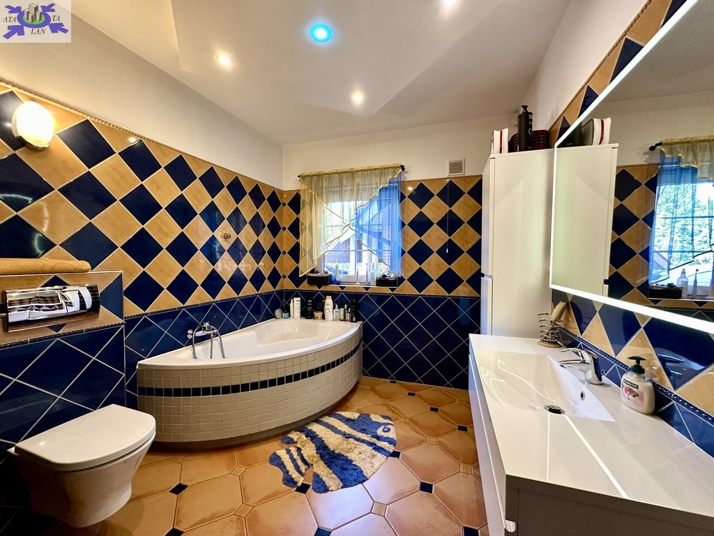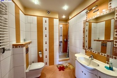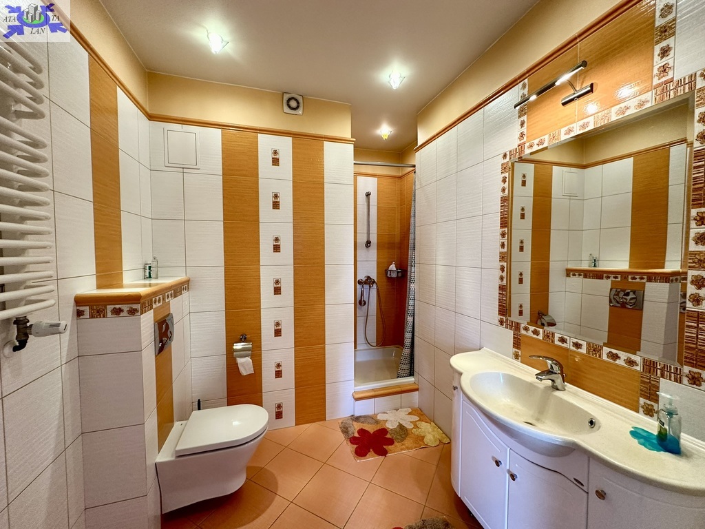 Duża kuchnia połączona z jadalnią wyposażona w meble na wymiar oraz sprzęty, takie jak zmywarka, lodówka, okap, płyta grzewcza. Na dole toaleta dla gości oraz łazienka z wanną umywalką oraz sedesem, natomiast górna łazienka z prysznicem. Ściany łazienek zostały wyłożone gresami.