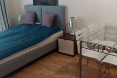 Pokój z wyjściem na duży balkon (umeblowaniesofa, komody, duże łóżko, szafki nocne, stół z krzesłami, tv)