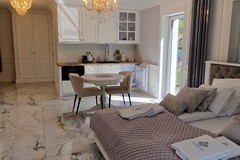 Tapicerowane niezwykle wygodne łóżko kontynentalne zostało wykonane na zamówienie. Sufity zdobią piękne, luksusowe żyrandole sprowadzone z Włoch. W kuchni znajdują się wysokiej klasy meble z pięknym drewnianym blatem oraz sprzęty renomowanej marki BOSCH. W niezwykle szykownej łazience zastosowano wielkoformatowe spieki,czyli kafle bez fug. Biały montaż luksusowej marki Villeroy&Boch, zaś armatura Hansgrohe.