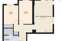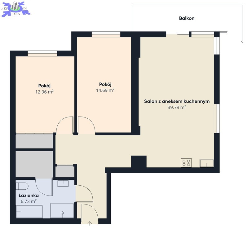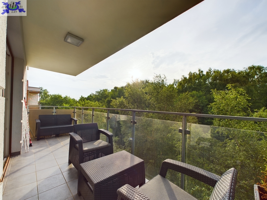 - Jasny przestronny salon z aneksem kuchennym, z którego przedostać możemy się również na balkon,