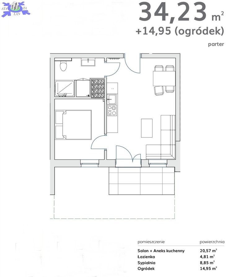 Apartament posiada swoje niezależne miejsce parkingowe na parkingu przed budynkiem. Do apartamentu przynależy taras powierzchni 14,95m2.