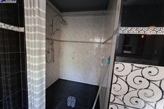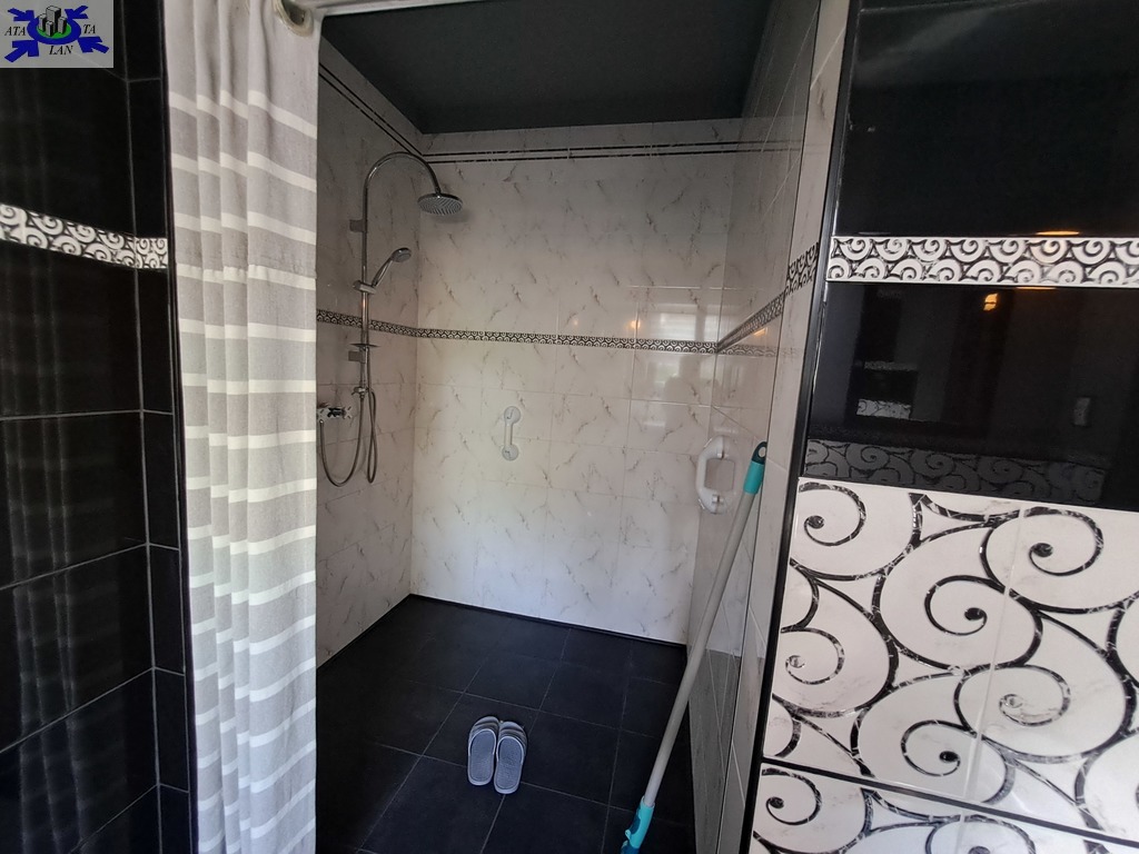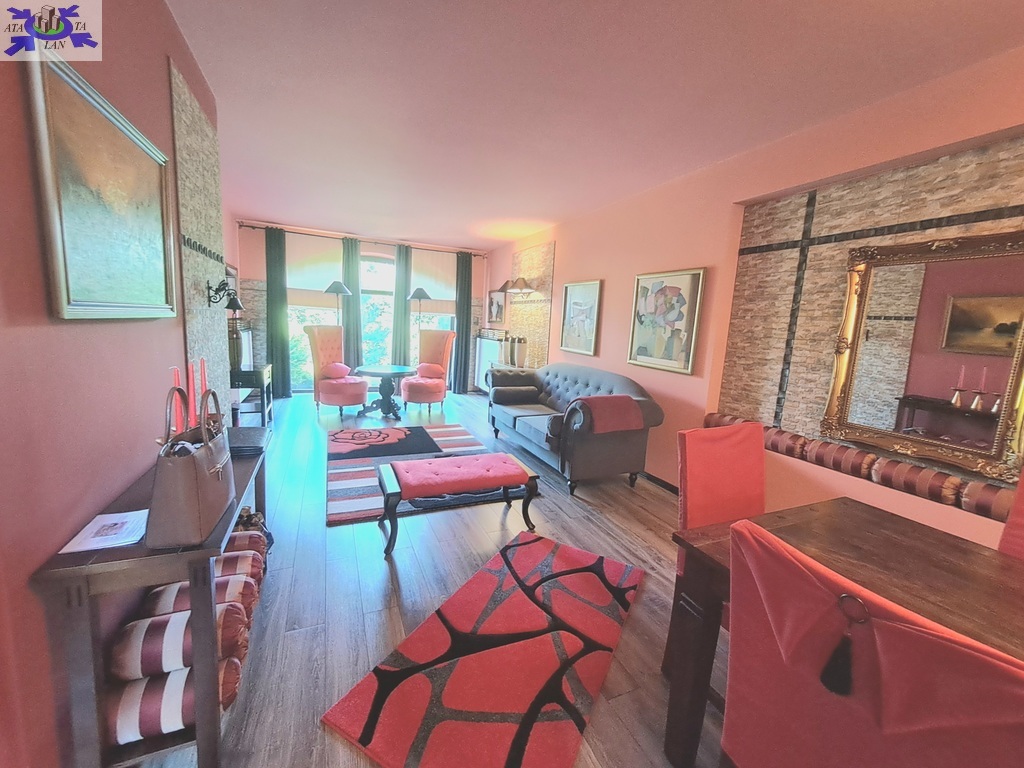 -Po lewej stronie wejście do przestronnego salonu z aneksem kuchennym ok. 50 m2, okna z dwóch stron na zimozielony ogród . W salonie i aneksie ciekawe wykończenie ścian kamieniem, które ładnie są wkomponowane w całość wystroju wnętrza.