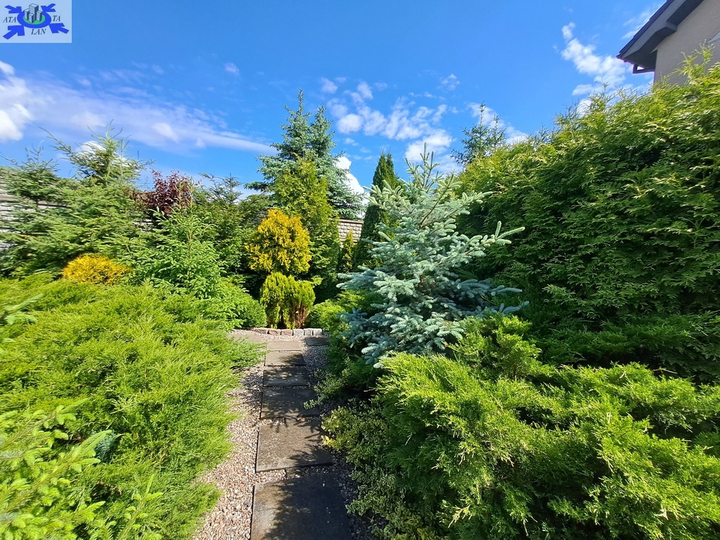 Otoczenie domu to zagospodarowany i pęknie utrzymany ogród z wytyczonymi ścieżkami i miejscem na odpoczynek przy śpiewie ptaków.
