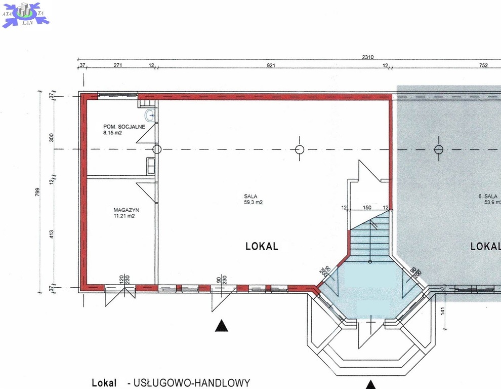 - Sali sprzedaży o powierzchni 59,3 m2, ściany gładzone pomalowane, na podłodze terakota.