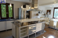 Z salonu wyjście na ogród i taras. Na podłogach panele i terakota. Meble kuchenne w zabudowie wraz ze sprzętem AGD firmy Siemens oraz Bosch lodówka z zamrażarką, zmywarka 60 cm, płyta ceramiczna, piekarnik.