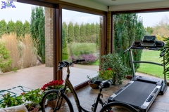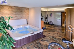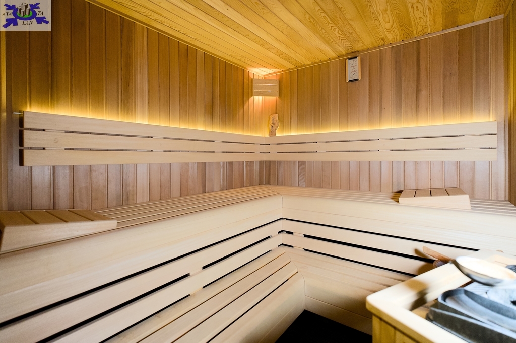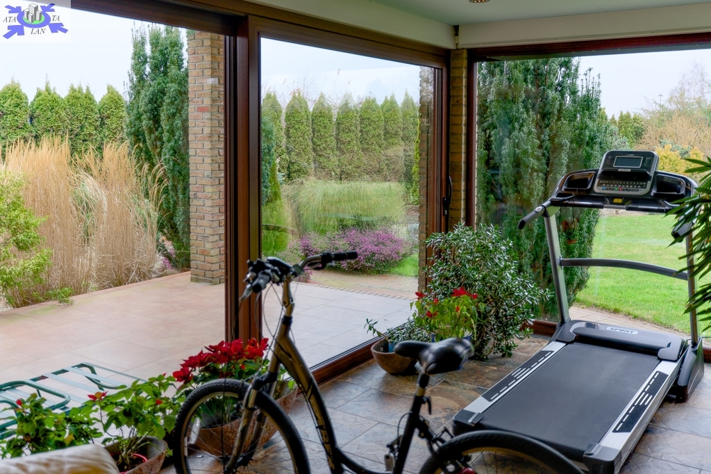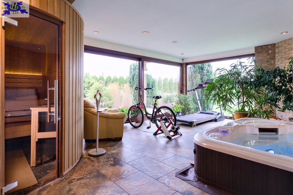 - przestrzeń relaksu/ SPA z sauną, jacuzzi i miejscem do ćwiczeń, z wyjściem do ogrodu, natrysk.