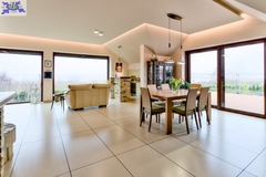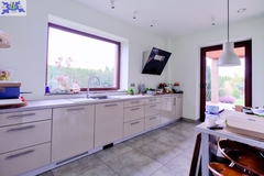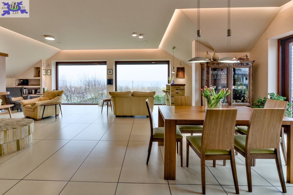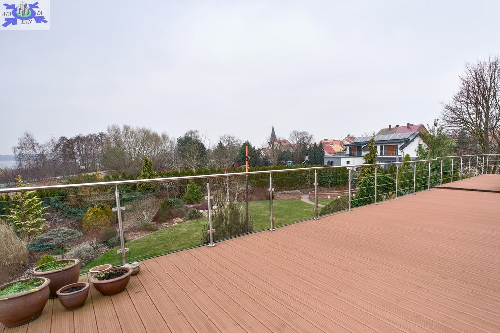 - salon połączony z jadalnią z wyjściem na duży taras 80 m2 z widokiem na jezioro