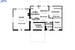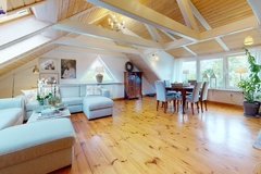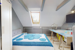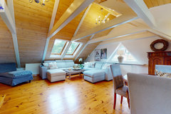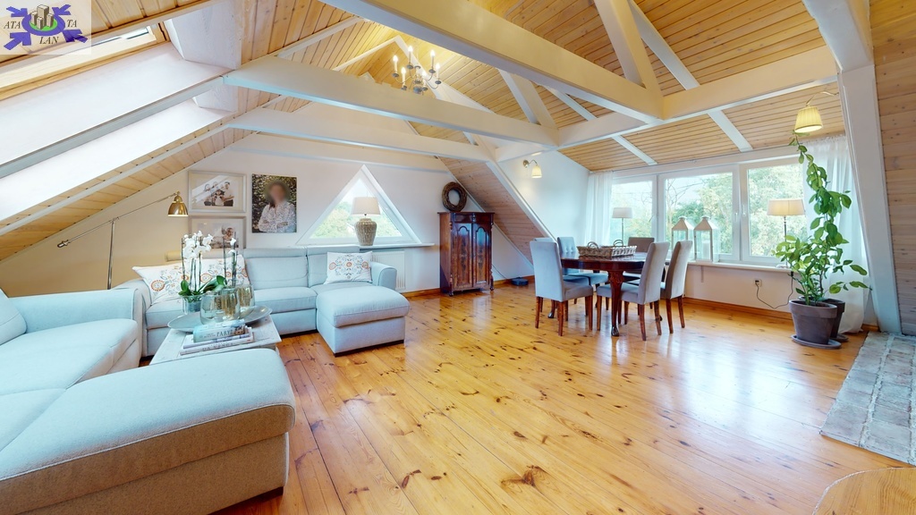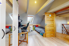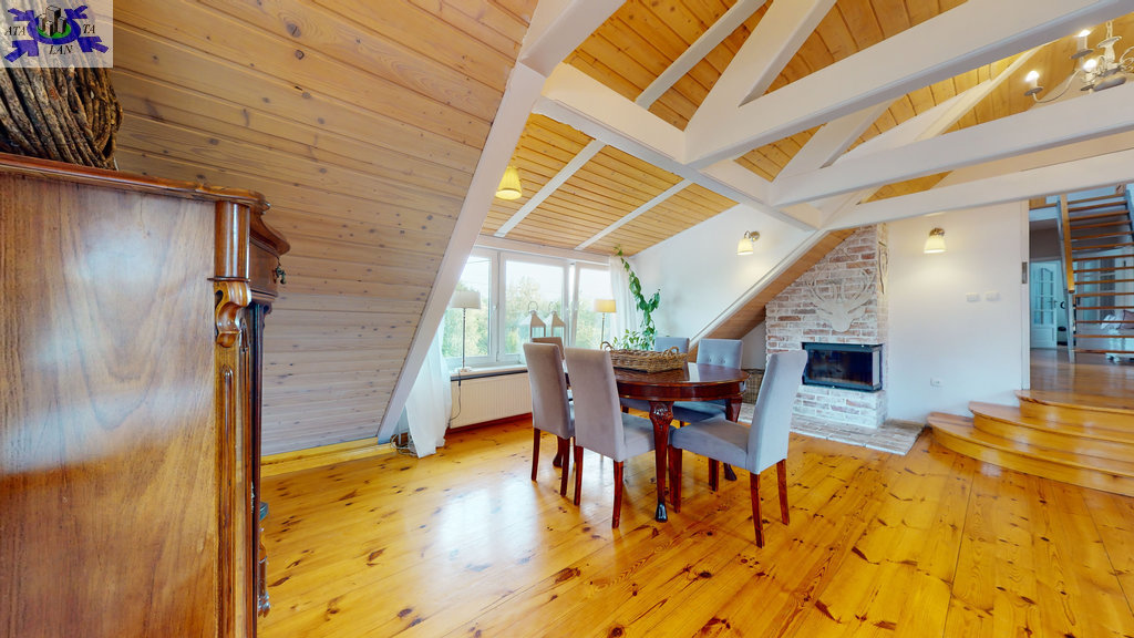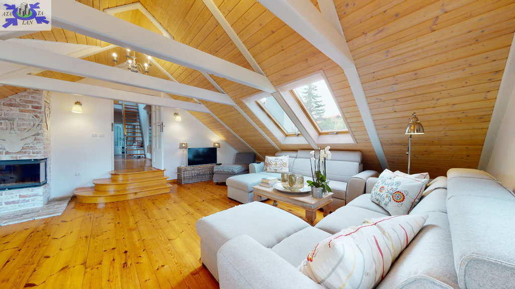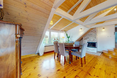 Część mieszkalną znajdującą się na piętrze i poddaszu tworzą