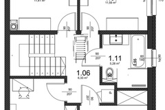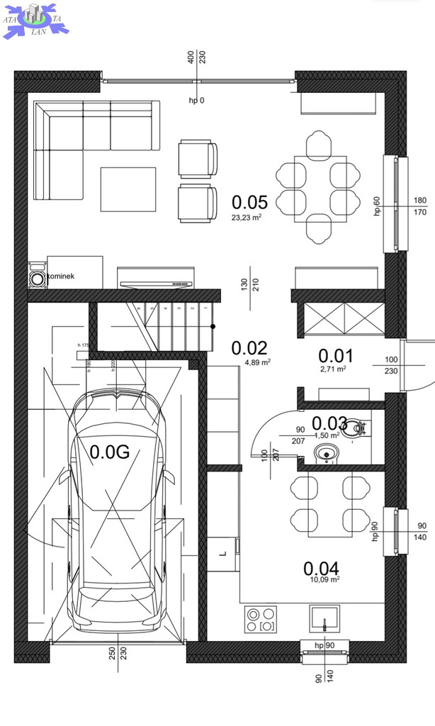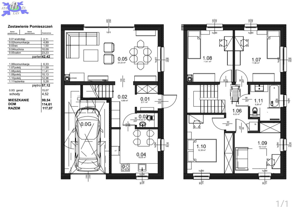 Powierzchnia całkowita budynku to 117 m2 łącznie z garażem.