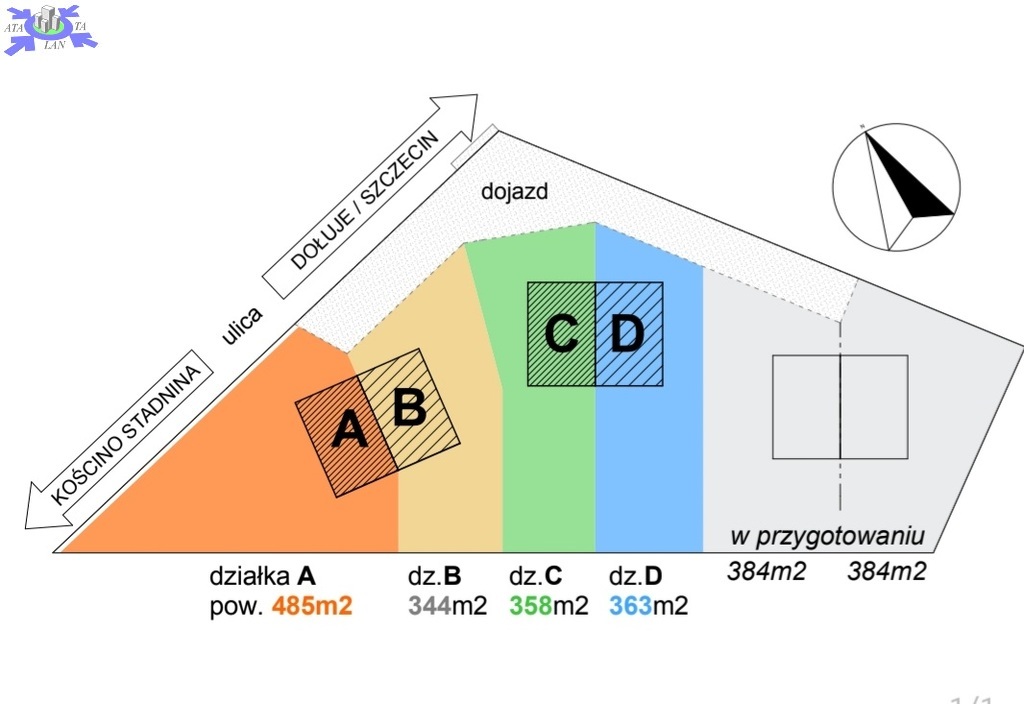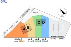 Inwestycja przewiduje trzy domy dwulokalowe ze sporymi działkami różnej wielkości (od 485m2 do 344m2).