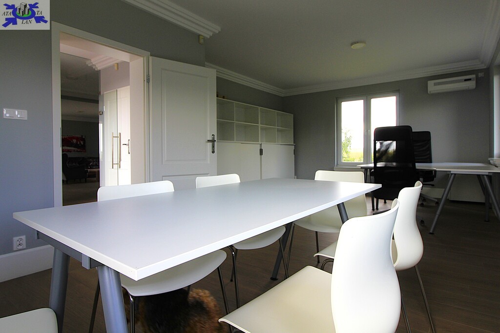 Dom i część biurowa są częściowo umeblowane. Nieruchomość wyposażona jest w okna i rolety antywłamaniowe oraz system alarmowy. Wysoki standard wykończenia zapewnia komfort i bezpieczeństwo.