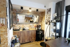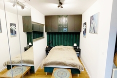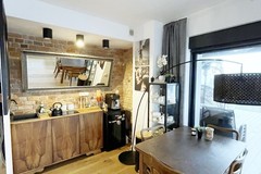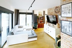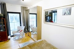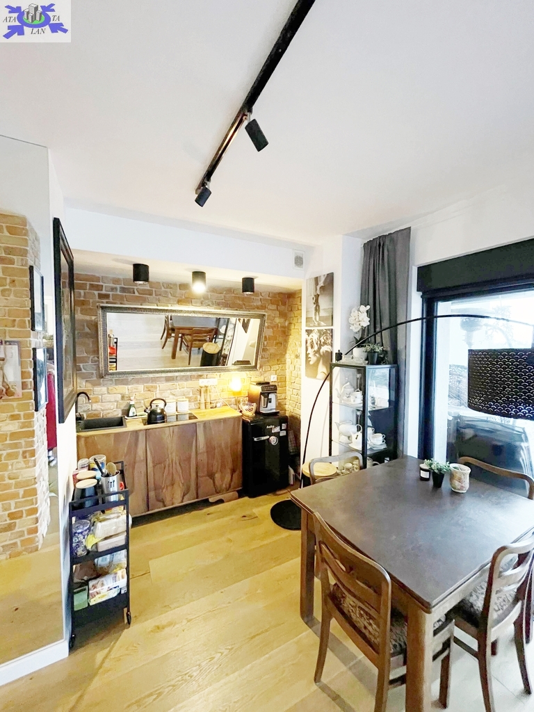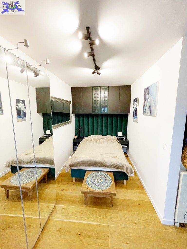 Apartament jest nowocześnie wykończony, z łazienką wyposażoną w kabinę prysznicową z odpływem liniowym wc i umywalkę oraz kompletnie wyposażonym i umeblowanym aneksem kuchennym ( meble w zabudowie, płyta kuchenna, zmywarka, lodówka) .