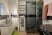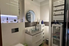 WC zostało połączone z łazienką i uzyskano ładną nowoczesną i przestronną przestrzeń, w której znalazł się prysznic z kaskadą, deszczownicą i masażami., muszla, umywalka, pralka oraz sporo powierzchni do przechowywania.