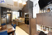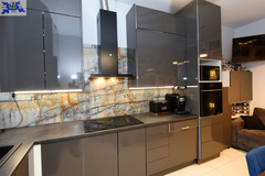 Open, window-lit , functionally designed space with built-in kitchen furniture and household appliances