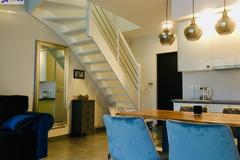 Na parterze pomieszczenia dzienne salon z aneksem kuchennym, łazienkę, przedpokój oraz drewniane schody prowadzące na 2 poziom. Z salonu wyjście na taras. Doskonałe doświetlenie wnętrza zapewniają duże, bezprogowe okna podłogowe, a dla zapewnienia odpowiedniej prywatności automatycznie sterowane żaluzje oraz system alarmowy. Ogrzewanie podłogowe gazowe na całej powierzchni apartamentu. Drzwi zewnętrzne i wewnętrzne drewniane.