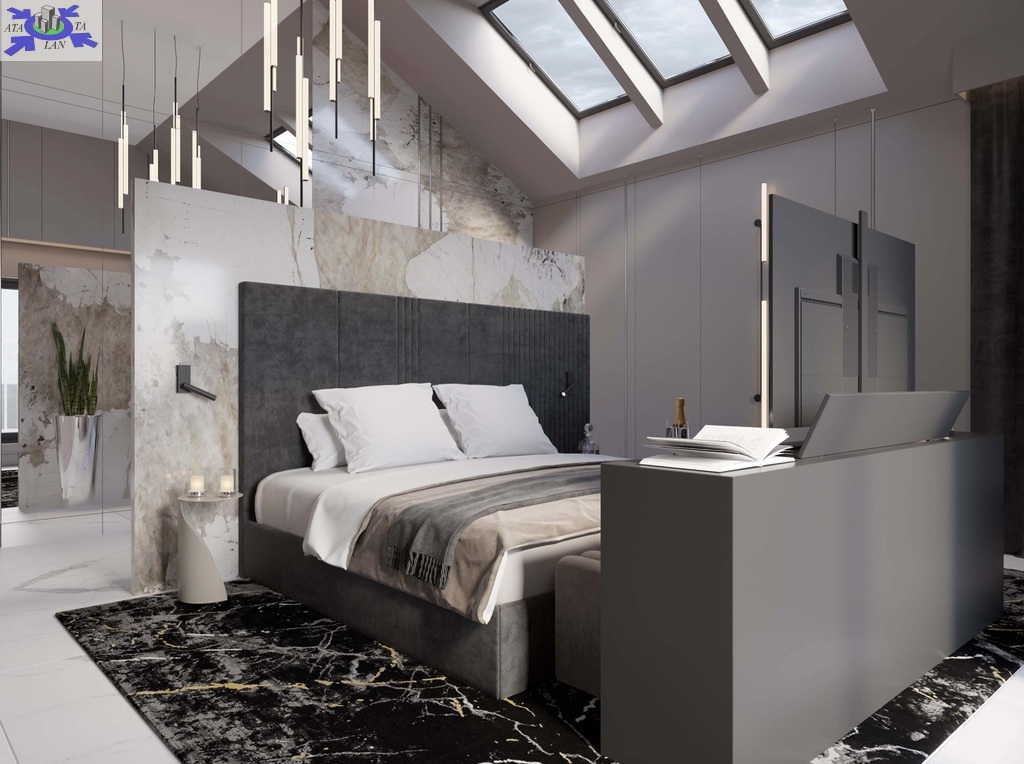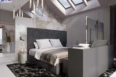 Druga główna sypialnia znajduje się na poddaszu, do której dostęp zapewniają schody prowadzące przez antresolę. Sypialnia, o pow. 28,14 m2, charakteryzuje się wysokimi skosami dachu, tworząc przyjemną atmosferę. W najwyższym punkcie pomieszczenia, osiągającym 4,09 metra, czuć przestrzeń i swobodę. Prywatna łazienka, o imponującej powierzchni 15,99 m2, może być śmiało nazwana pokojem kąpielowym, oferując wyjątkowy komfort i luksus. Wysokość pomieszczenia łazienki od 2,86 do 3,41 m. dodaje uczucia przestronności i elegancji.