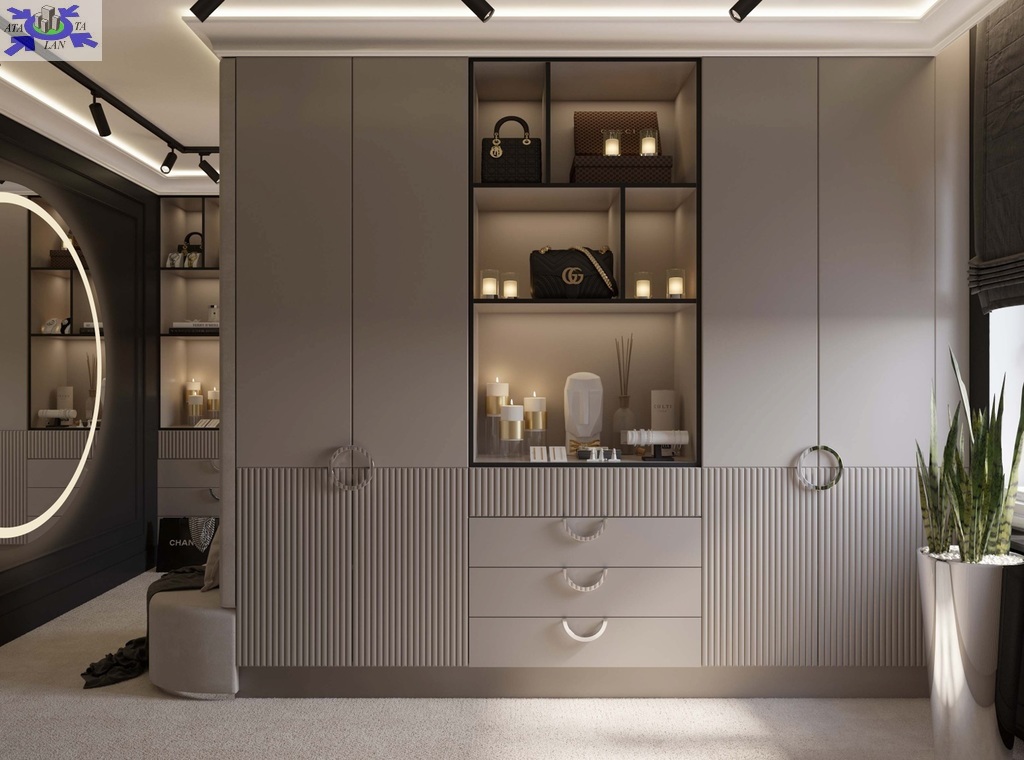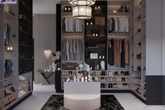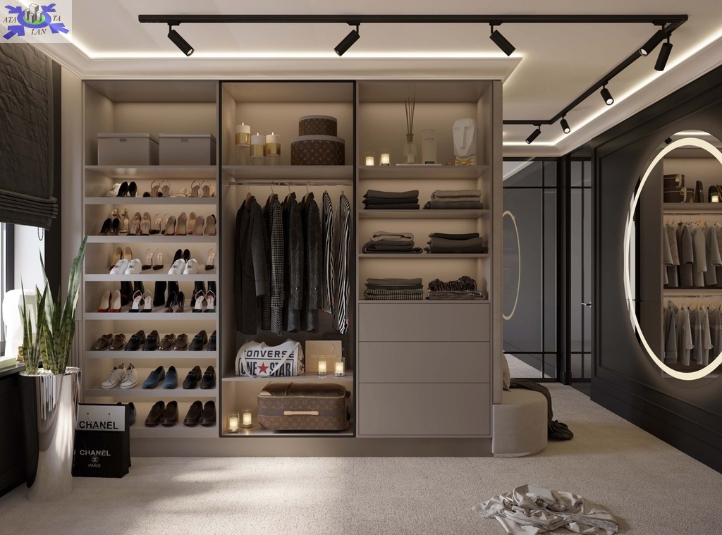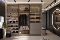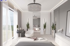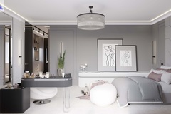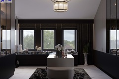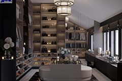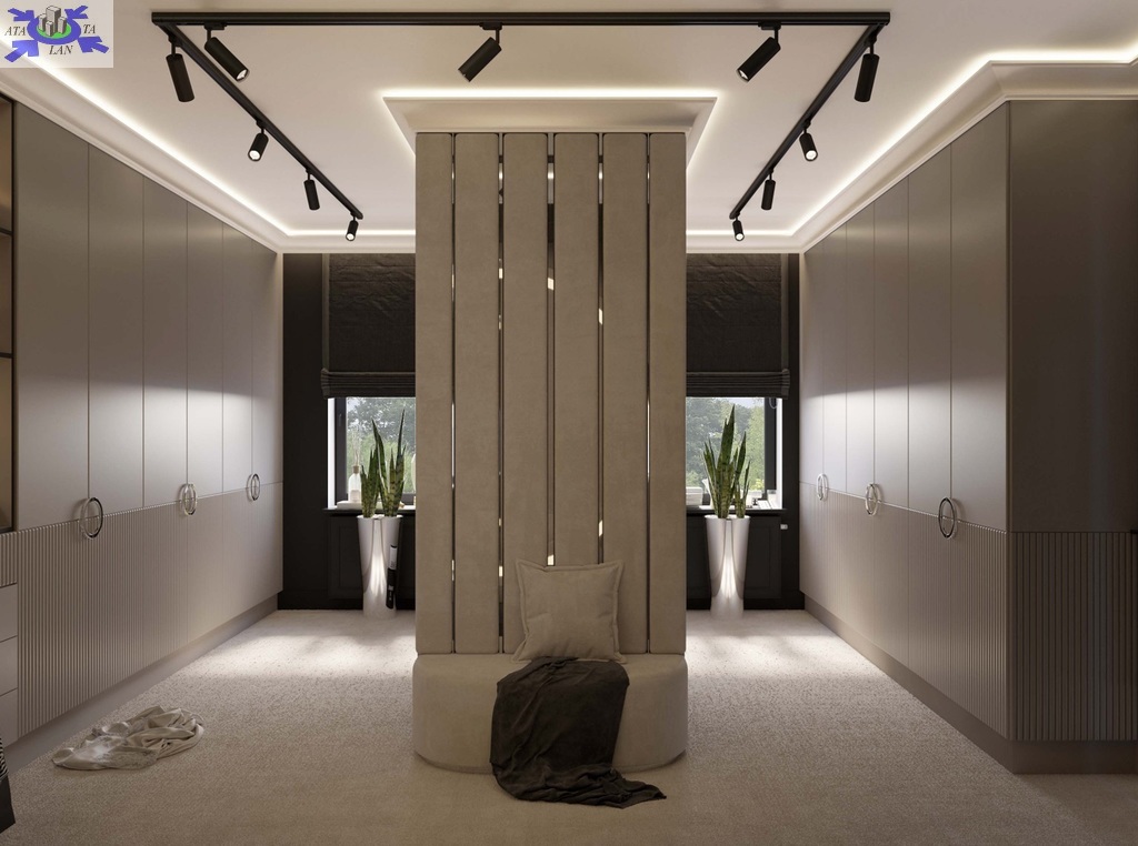 Jedna z dwóch głównych sypialni o pow. 20,81 m2 ,znajduje się na parterze, po prawej stronie od wejścia i obejmuje dużą, luksusową łazienkę o pow. 13,65 m2 oraz garderobę składającą się z dwóch połączonych pomieszczeń, wyposażonych w elegancką zabudowę. Pierwsze pomieszczenie garderoby ma pow.10,80 m2 drugie o pow. 11,95 m2. Garderoba ta pozwala na podział na część damską i męską lub letnią i zimową, według uznania.