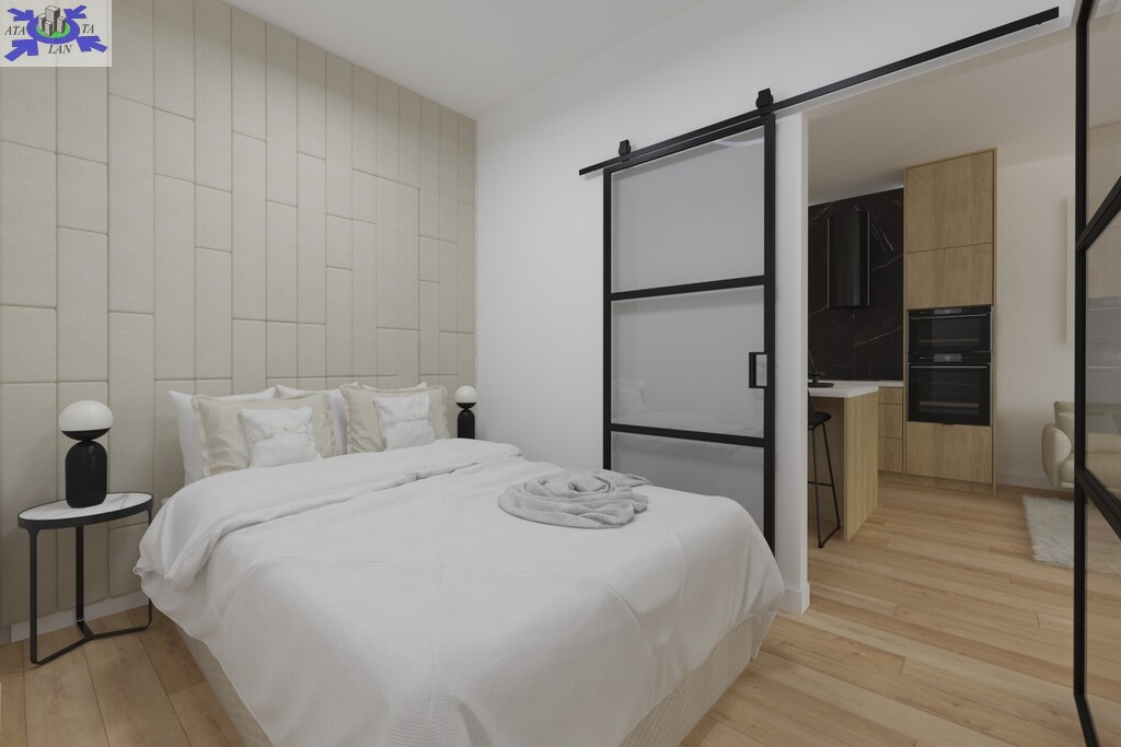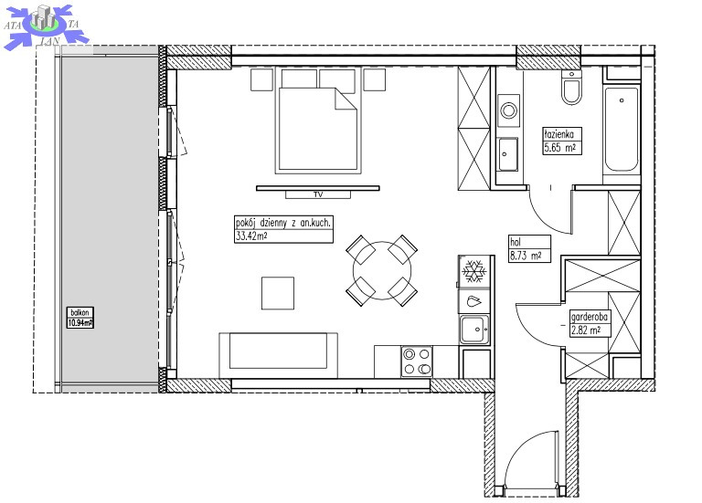 Apartament o powierzchni 48,65, składa się z salonu z aneksem kuchennym, wydzielonej sypialni, łazienki, garderoby i holu.