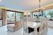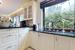 -Salon z kominkiem i aneksem kuchennym z dużymi oknami antywłamaniowymi wychodzącymi na zieleń ogrodu