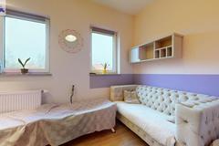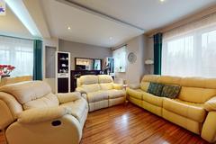 - Pomieszczenia 5 pokoi (salon, 3 sypialnie, biuro) w tym 1 w przyziemiu jako biuro, kuchnia, 2 łazienki, garaż, pomieszczenie techniczne z kolejną toaletą.Rozkład