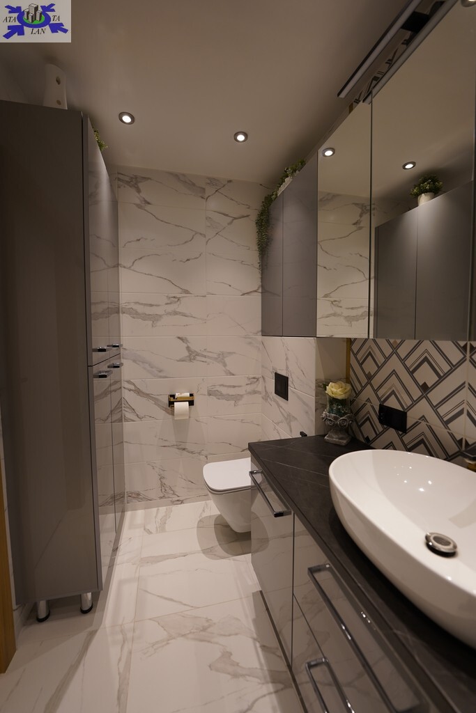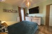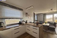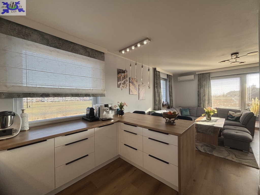 W kuchni zabudowa na wymiar, wyposażona w sprzęt AGD ( zmywarka, okap, płyta indukcyjna, lodówka, piekarnik . Dodatkowo pomiędzy częścią wypoczynkową, a kuchnią, zamontowano bardzo duży i wygodny barek.