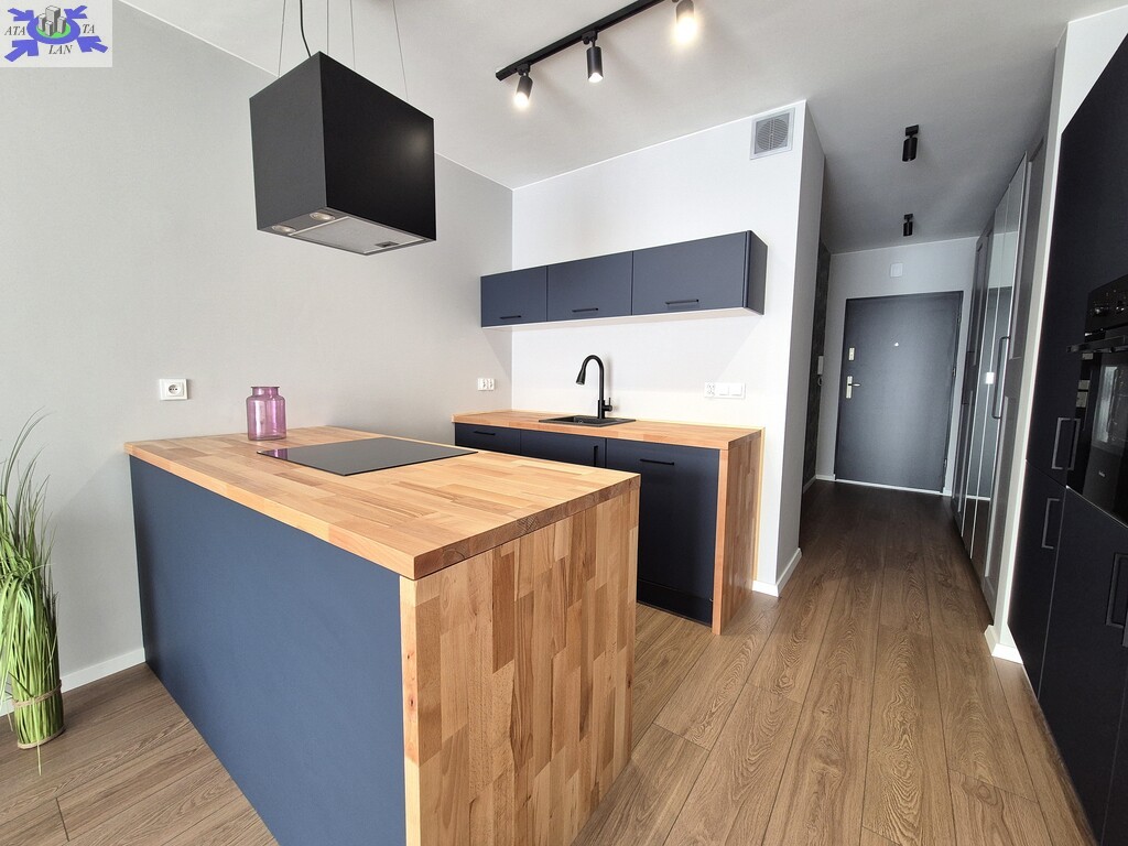 - pokój z aneksem kuchennym. Część kuchenna w nowoczesnej zabudowie z wyspą. Na wyposażeniu płyta indukcyjna, zmywarka, piekarnik, zlew, lodówka z zamrażarką.