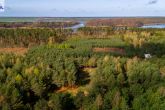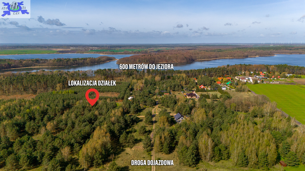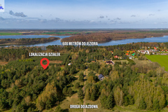 Działki otoczone są lasem, a to ostatnia linia zabudowy ze ślepą drogą. W odległości 300 m znajduje się jezioro z zagospodarowaną plażą.