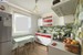 Kuchnia w kształcie zbliżonym do kwadratu, na podłodze położone panele, ściany wygładzone i pomalowane