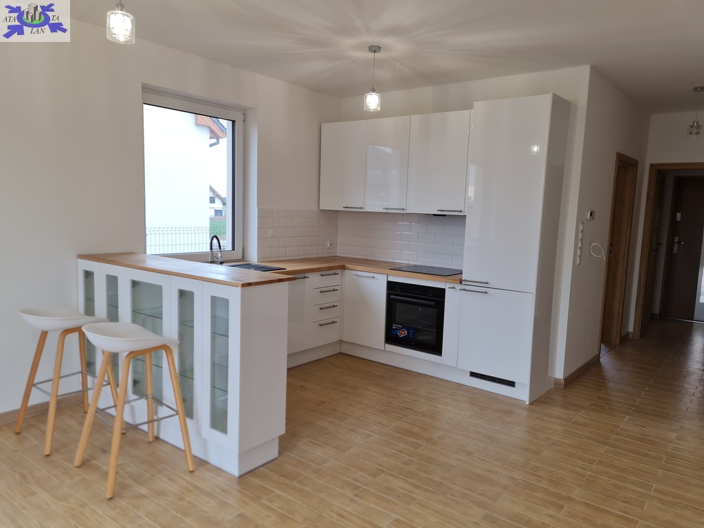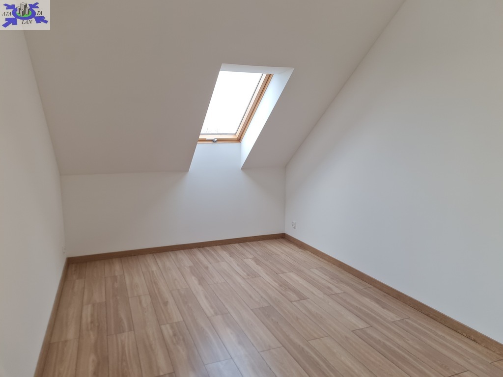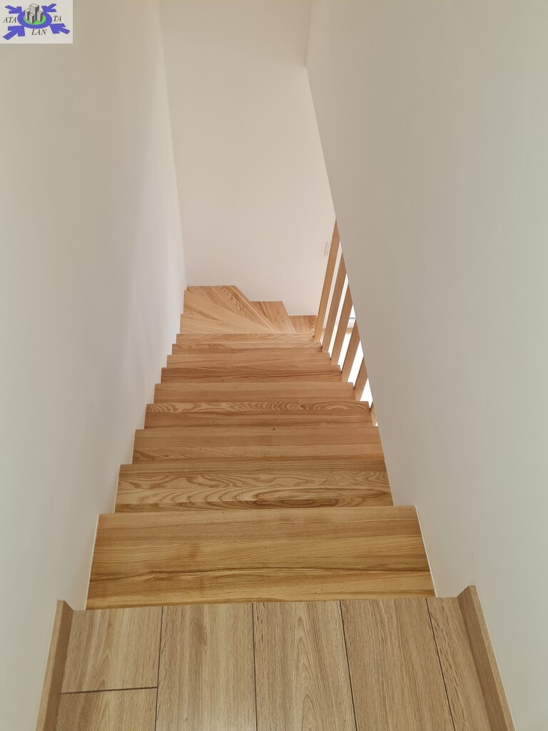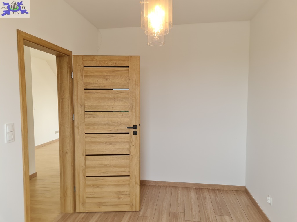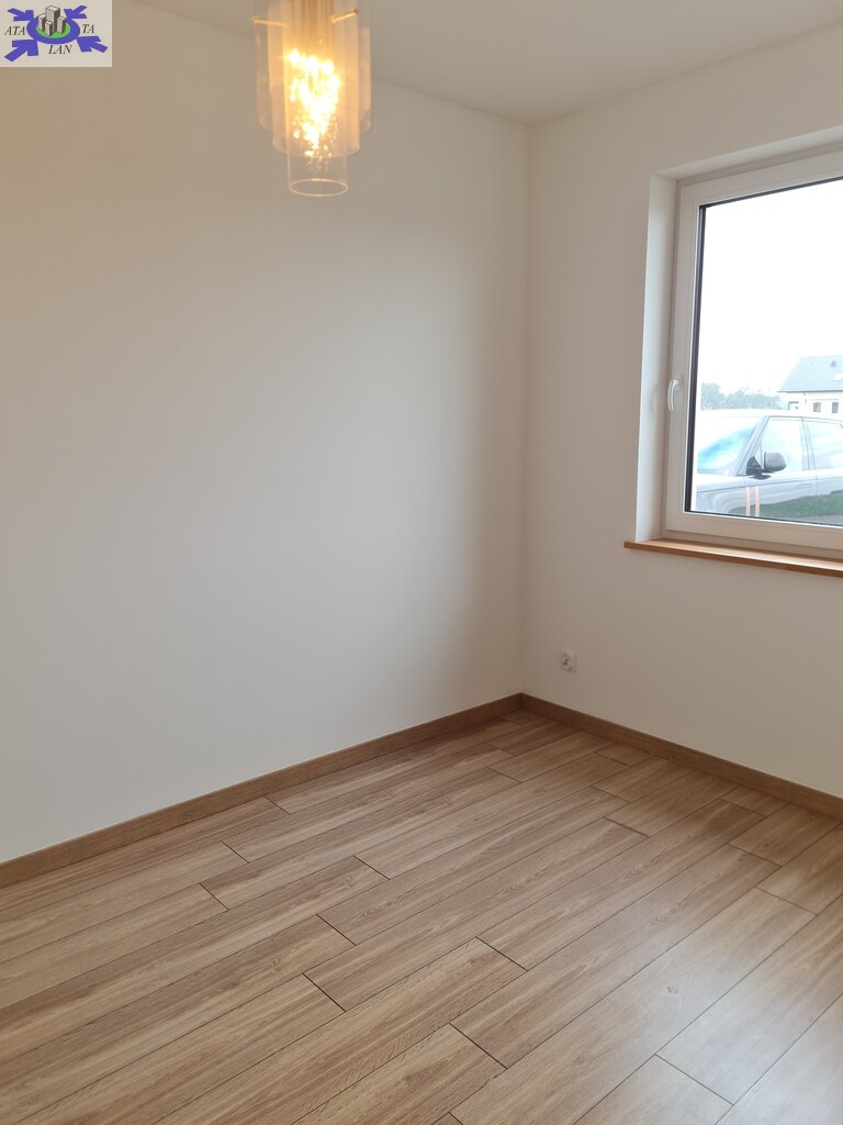 Dom składa się z salonu otwartego na kuchnię, sypialni, łazienki i hollu oraz na piętrze znajdują się z dwa rozkładowe sypialnie i łazienka.