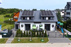 Fundamenty wykonane są z bloczków i dodatkowo docieplone. Dom jest z drewna, dach z blacho-dachówki, poza tym teren wyłożony jest kostką brukową i ozdobiony licznymi nasadzeniami. Podłączenie do deszczówki gminnej. Drzwi antywłamaniowe, okna PCV.