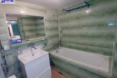Łazienka w glazurze i terakocie starszego typu z zabudowaną wanną.