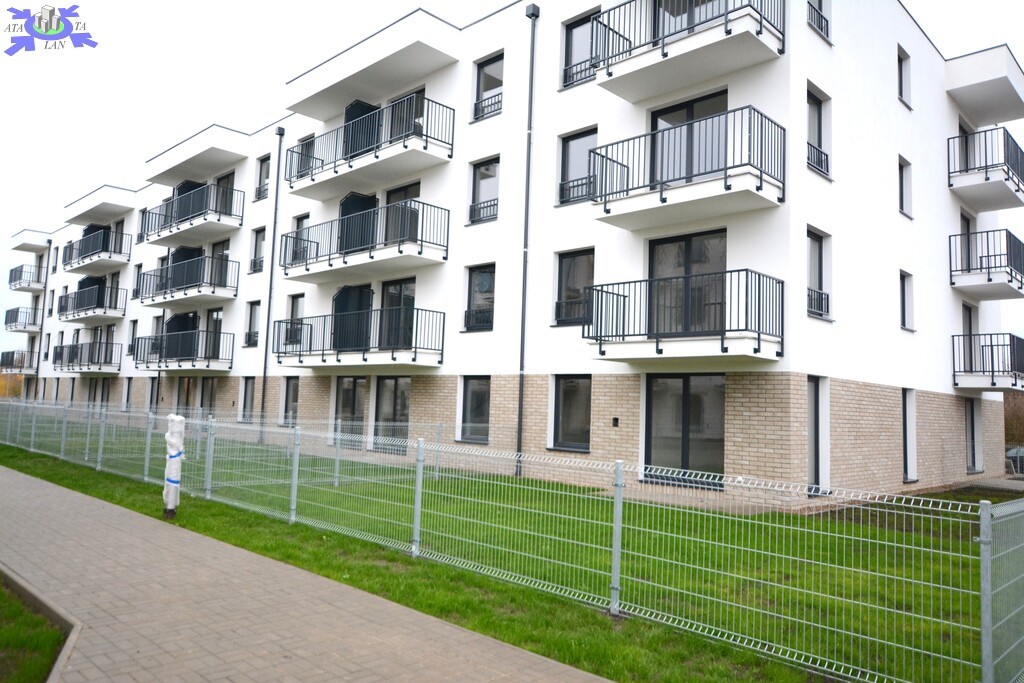 Nowoczesna architektura, kompleksowo zagospodarowany teren osiedla, chodniki, niskie nasadzenia, plac zabaw dla najmłodszych.