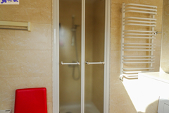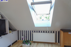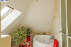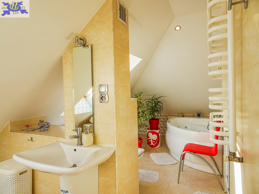 PIĘTRO ze skosami pokój o powierzchni użytkowej 11,63 m2 po podłodze około 20 m2 i sypialnia po podłodze ok. 20 m2 z wejściem do garderoby, i pomieszczenie gospodarcze. Łazienka 4 m2 po podłodze ok. 10 m2 w niej wanna narożna, kabina prysznicowa, umywalka WC razem. W łazience okno, jasna glazura i terakota, średnie rachunki za energię elektryczną 600 zł.