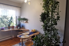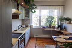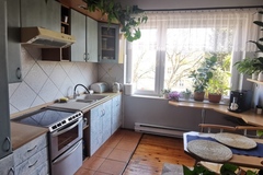 kuchnia z oknem, z jadalnią o pow. ok. 12 m2, bardzo jasna, z meblami starszego typu, na podłodze deski, ściany gładzone malowane (od strony ulicy - wschód),