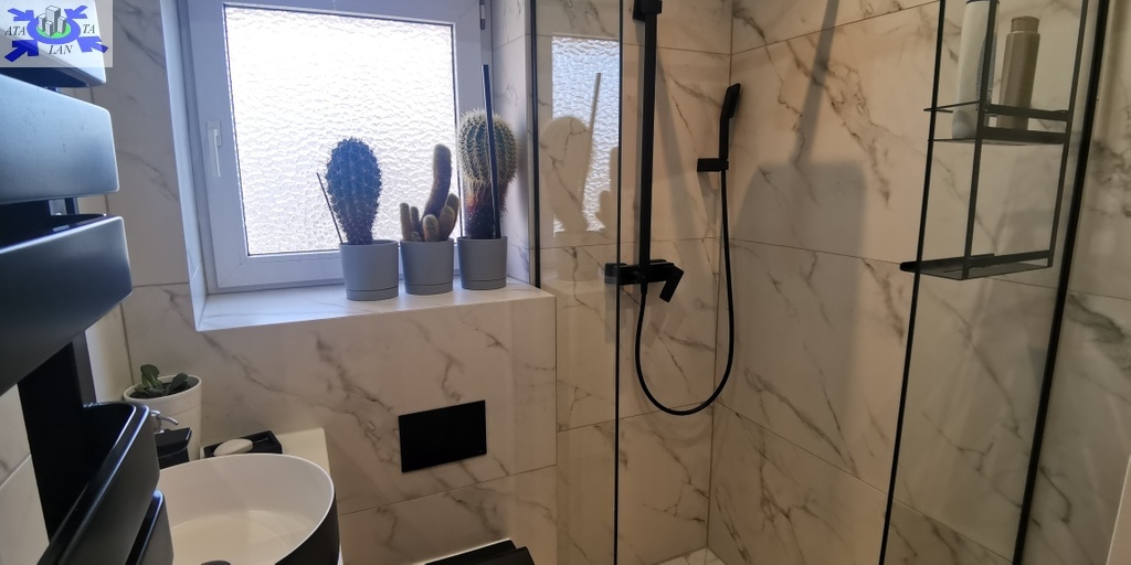 łazienka z oknem, o pow. ok. 3,5 m2, z kabiną prysznicową, umywalką i wc (remont 6 lat temu),