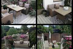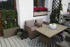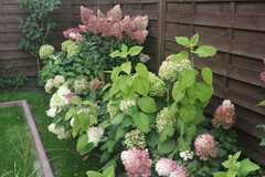 - Ogródek oraz teren przed domem wyłożony kostką brukową i ozdobnymi nasadzeniami.