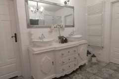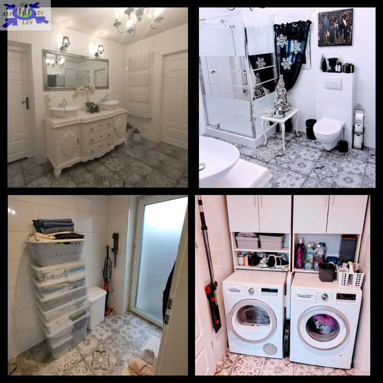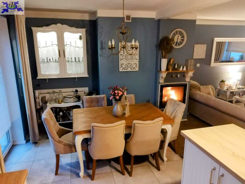 Parter domu charakteryzuje się przestronnością i funkcjonalnym układem. Kuchnia wyposażona w zabudowę na wymiar oraz wysokiej jakości sprzęt AGD. Ważnym atutem jest kominek z płaszczem wodnym, który stanowi alternatywne źródło ogrzewania. Łazienka z dużym prysznicem i podwójną umywalką. Z pralni wyjście na ogród, co ułatwia codzienne obowiązki. Jadalnia z wyjściem na drewniany taras o powierzchni 15 m2.