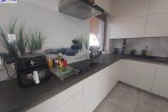 Kuchnia została zaprojektowana w zabudowie, wyposażona w sprzęty AGD, co zapewnia komfort użytkowania oraz nowoczesny wygląd.