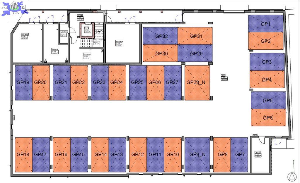 Na parterze dużego bloku zlokalizowany będzie garaż z miejscami parkingowymi (32 miejsc), natomiast w obrębie osiedla zapewniono 22 miejsca parkingowe "pod chmurką".