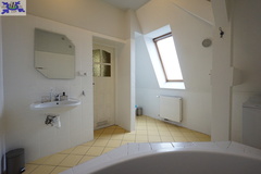 Łazienka widna, razem z WC, wyposażona w wannę, w glazurze i terakocie starszego typu.